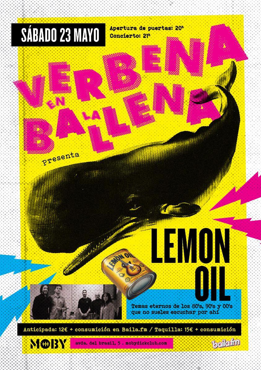 Verbena en la Ballena es el tardeo que se alarga más de la cuenta… y con los mejores temazos del rock. Y para esta verbena primaveral recibimos a Lemon Oil, una banda veterana en los locales de Madrid. Llevan más de 20 años subiéndose a escenarios, con una propuesta muy divertida y con gran calidad en la interpretación y el sonido. 3 décadas es un homenaje a esa música intemporal que conoces muy bien, con temas eternos de los 80's, 90's y 00's, y que no sueles escuchar por ahí. Lemon Oil rescata esas canciones míticas para que cantes y bailes sin parar. Permitida la entrada a menores de 16 años acompañados por madre, padre o tutor legal mediante autorización.