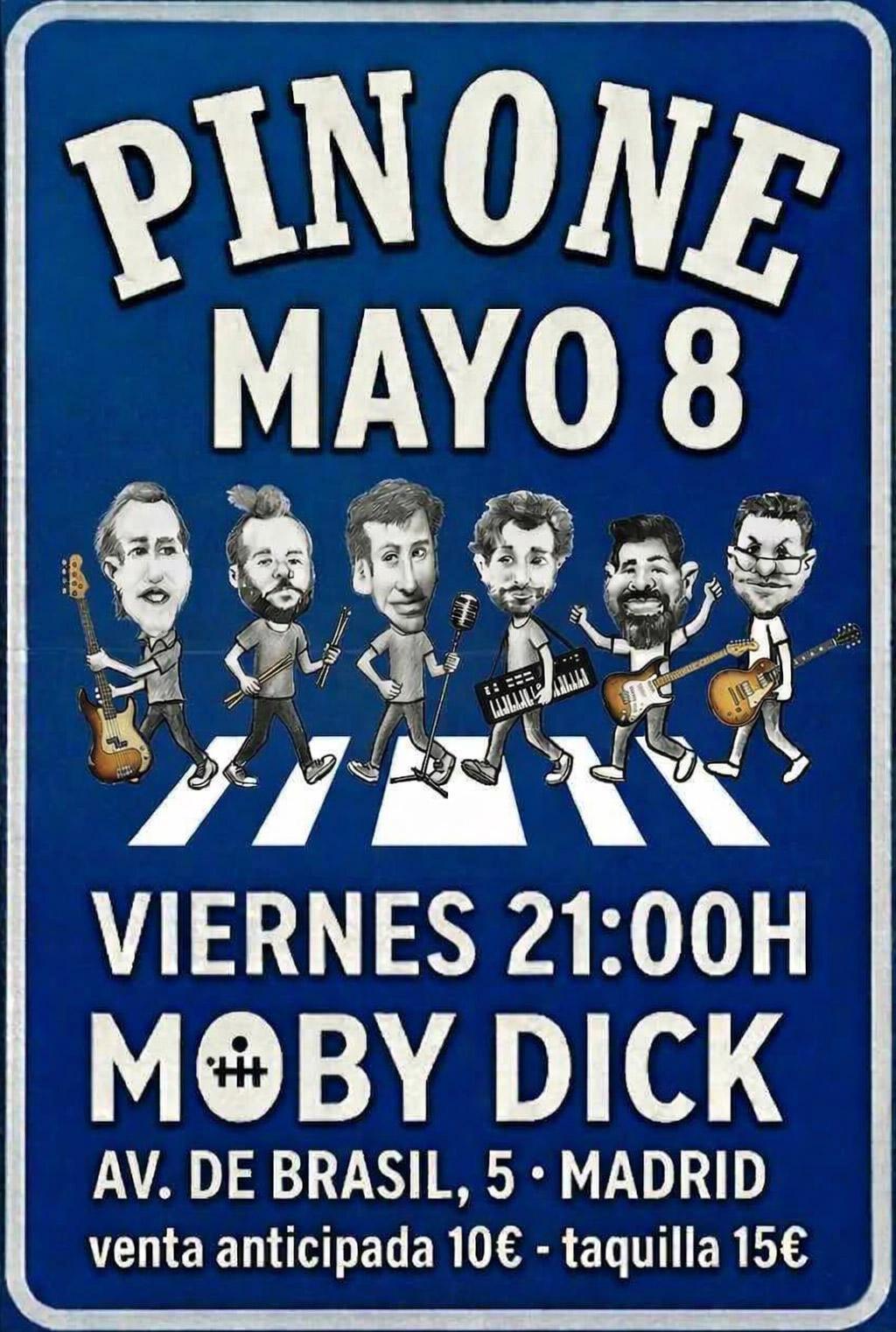 La banda PINONE regresa a Moby Dick tras el éxito de su anterior actuación, consolidándose como una propuesta sólida dentro del circuito de versiones indie. El grupo está liderado por Ion Aramendi, conocido presentador de televisión en Telecinco, que aporta carisma y presencia escénica como frontman.
