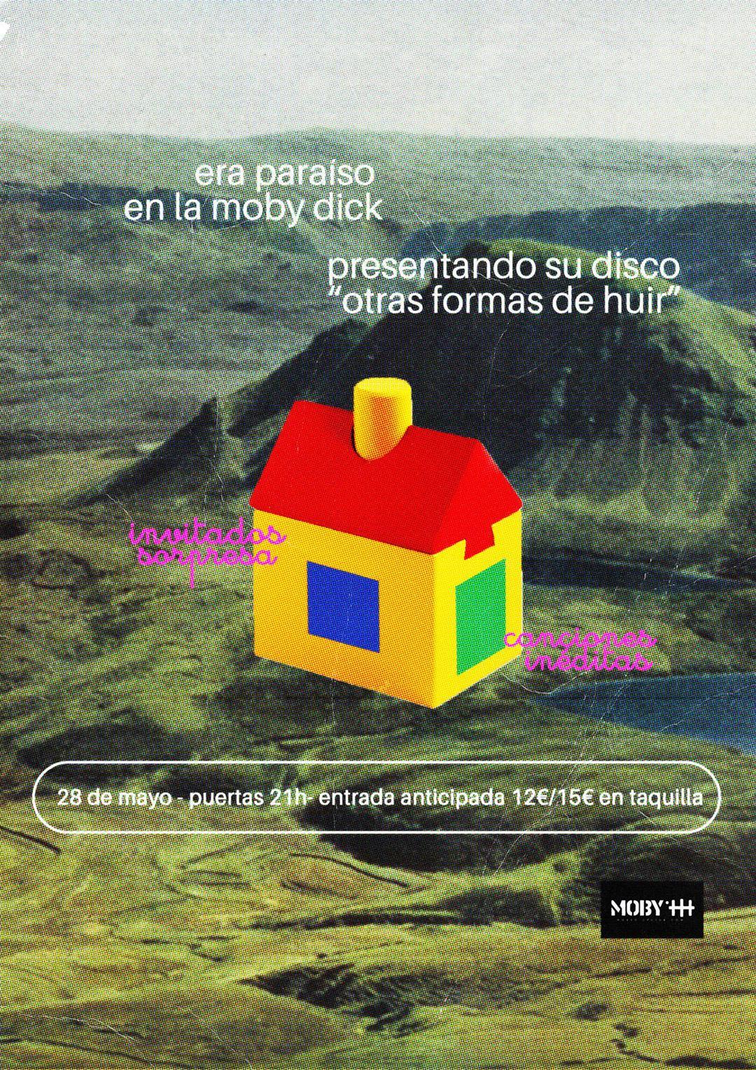 Era Paraíso vuelve a los escenarios para presentar su nuevo disco "Otras Formas De Huir". Tras su paso por esta misma sala con "La Maratón Mundial (2021)", la banda regresa a Moby Dick con un concierto muy especial en el que sonarán canciones inéditas junto a temas de su primer disco. Además, contarán con amigos de la escena que se subirán al escenario para compartir algunas de estas canciones. Una noche inolvidable para despedir una etapa y dar la bienvenida a una nueva.