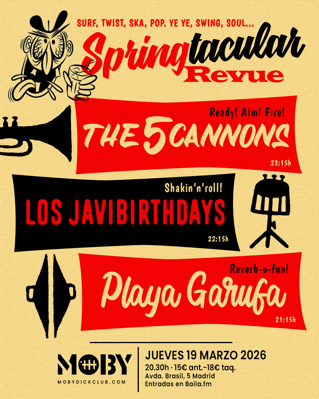 Tres bandas. Tres estilos que no deberían mezclarse… pero se han mezclado: The 5 Cannons: Ready! Aim! Fine! + Los JaviBirthdays: Shakin'n'Roll! + Playa Garufa: Reverb-o-fun!